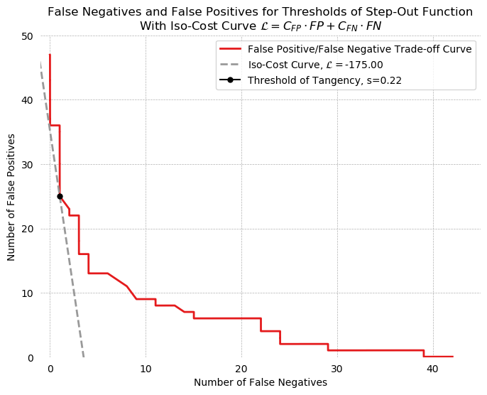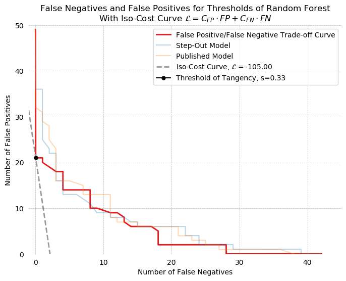 Given that the Random Forest was the only model that scored higher than the published model, we now score it. An optimum iso-cost curve is computed below to determine a threshold, and confusion matrices are built using this threshold. The iso-cost curve using the same numerical example as before is plotted along with the Random Forest classifier error curve, along with that of the step-out and published models for comparison. The Random Forest achieves fewer false positives in-sample without making a single false negative, allowing the loss function to drop to -105 at a higher threshold of 0.33.
