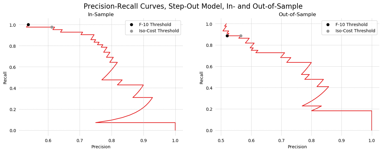 In-sample confusion matrices for both the Random Forest and the step-out model are presented next. Both classifiers have been set to their respective iso-cost minimizing threshold. The random forest performs better in every category, achieving higher precision and higher recall, plus better overall accuracy.