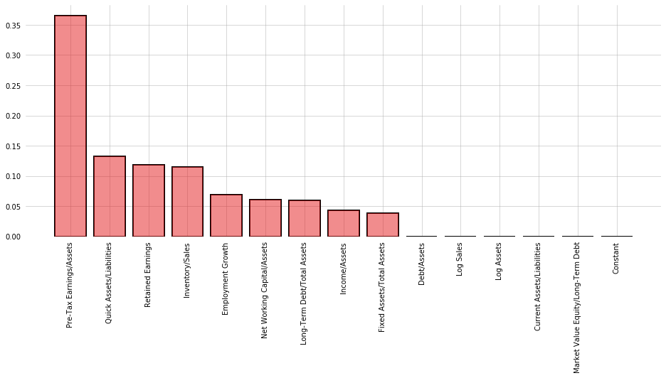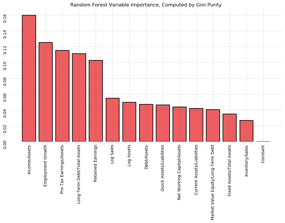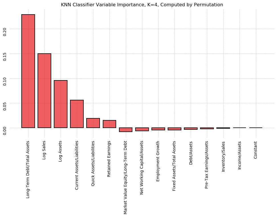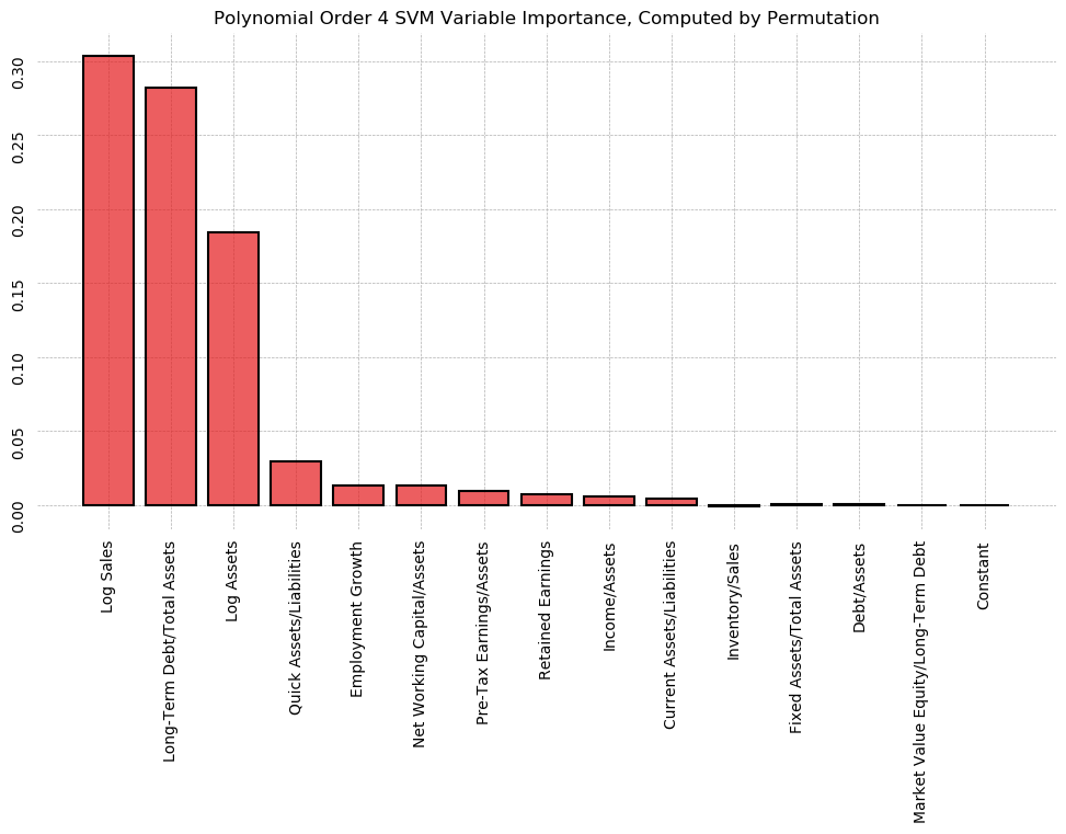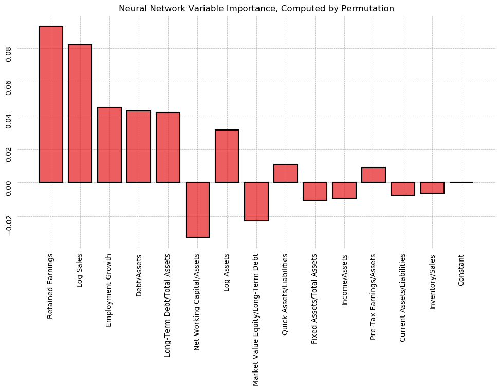 After running 12 models, there is a much richer information set from which to evaluate features. The importances of each feature, as evaluated by either coefficient size, Gini purity, or perturbation analysis, are presented below. Lower numbers indicate higher importance, so for example, Retained Earnings was the most important feature in the Neural Network. To get a global sense of the most important variables, the sum across rows is computed and subtracted from 225. To attempt to give more weight to better performing models, the rankings of each variable are also multiplied by the model out-of-sample AUC, then summed. The results are graphed below.