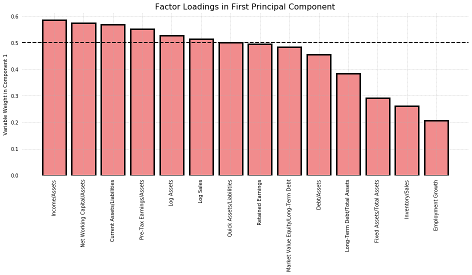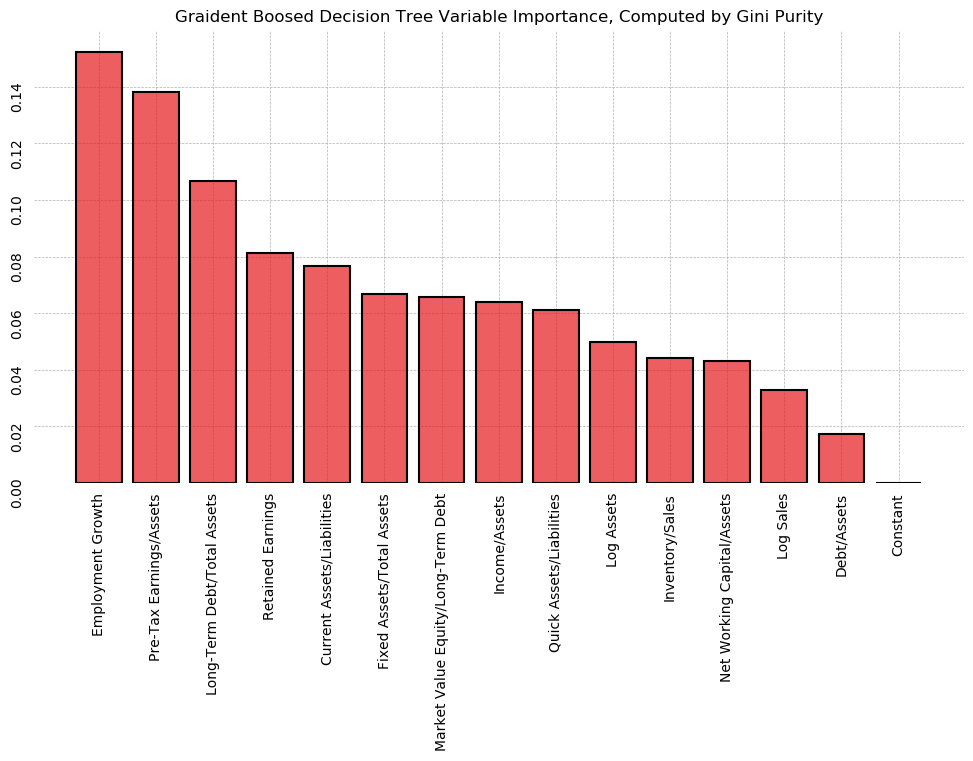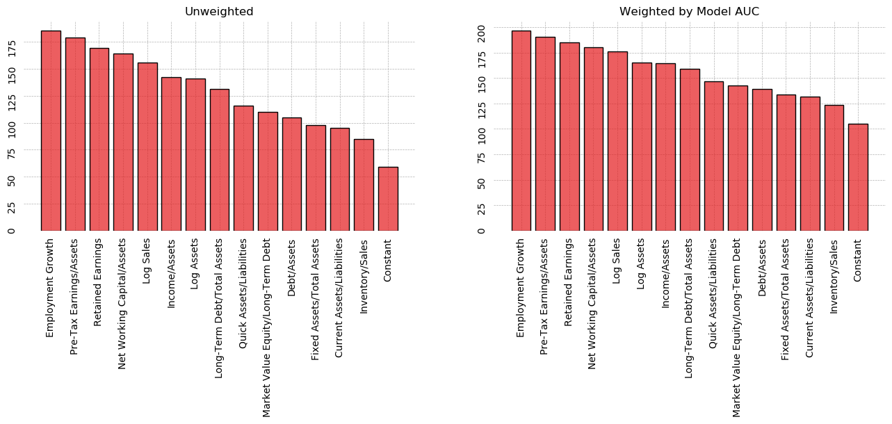 In both cases, Employment Growth is found to be the most important overall feature, followed by Pre-Tax Earnings/Assets. Whether or not weights are added, the next 3 are Net Working Capital/Assets, Log Sales, and Retained Earnings, though weights change the specific order. The bottom 6 are also stable to the AUC weighting.