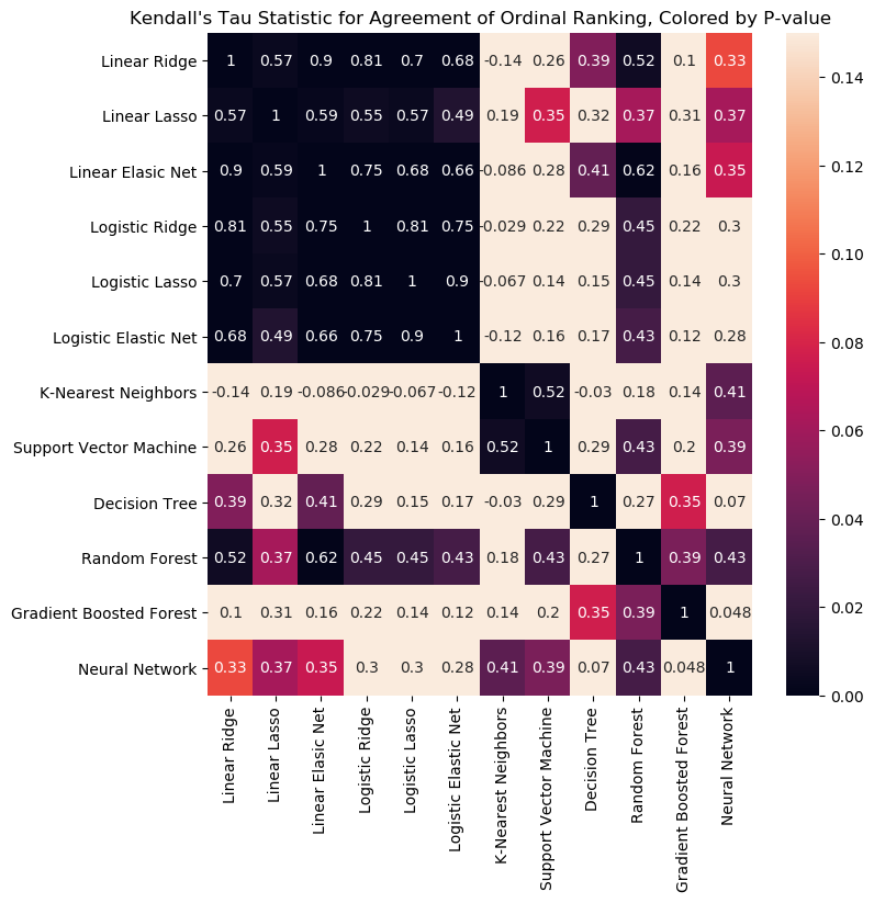 Pairs with a high Kendall's Tau give the same ordinal ranking to variable importance. The statistics are plotted in the heat map below, with the color set to the p-value of the statistic. Dark squares are strongly significant, while beige colors are not significant at the 10% level. Unsurprisingly, the family of regularized linear classifiers largely agree on variable importance. K-Nearest Neighbors and Support Vector Machine also strongly agree on ranking. The model which seems to best capture the consensus of the entire group is the Random Forest, which ranked variables similarly to all models except KNN and Decision Trees.