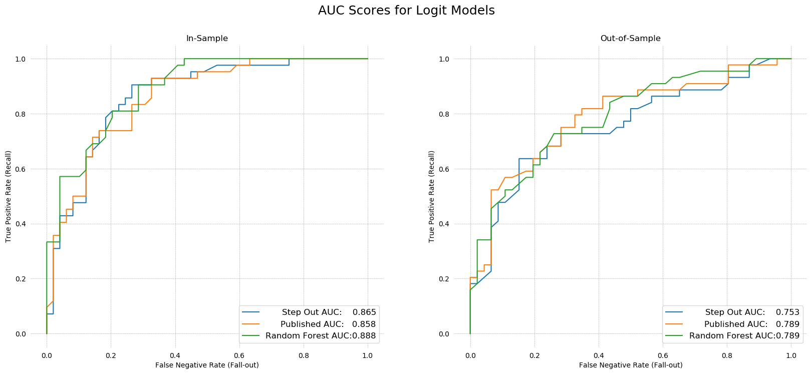 Finally, ROC scores are plotted for 3 models: my two "selected" models, plus the benchmark published model. Note that the out-of-sample ROC of the published model has gone up due to the interpolation of the missing variables. As a result, the random forest now performs no better out-of-sample than this model. Nevertheless, the loss-function is better minimized with the random forest, making this a good example of how to compare two models with equivalent AUC scores.
